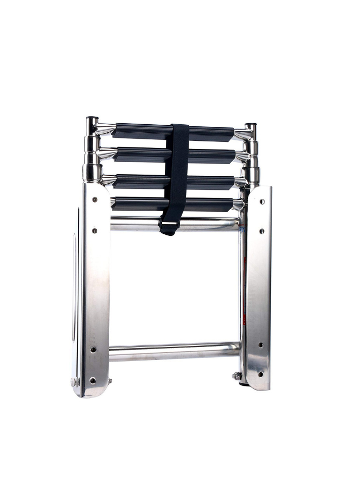 • Die Teleskopstufen dieser Bootsleiter lassen sich schnell und mühelos im Wasser einklappen und ermöglichen so ein sicheres Einsteigen. Zum Verstauen sind die flachen Edelstahlstufen kompakt zusammenklappbar, was der Badeleiter ein besonders elegantes Aussehen verleiht.