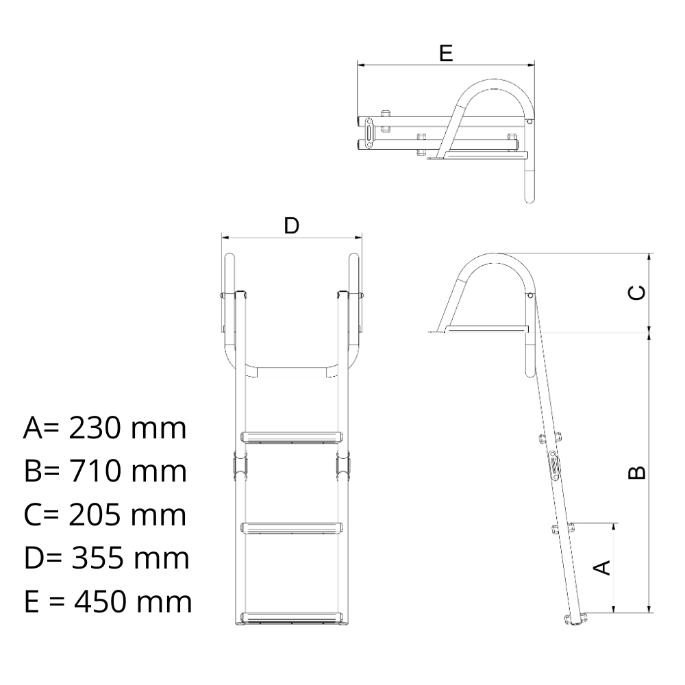 The swim ladder is ideal for use with your boat or for installation on a dock. Made of 316 stainless steel, it's durable. The steps are made of teak for a secure grip and a beautiful appearance.